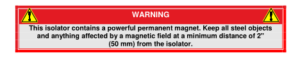 L’isolatore (cilindro nero centrale) contiene un magnete permanente forte. Tenere qualunque oggetto soggetto ai campi magnetici a una distanza minima di sicurezza di 50 mm dall’isolatore.